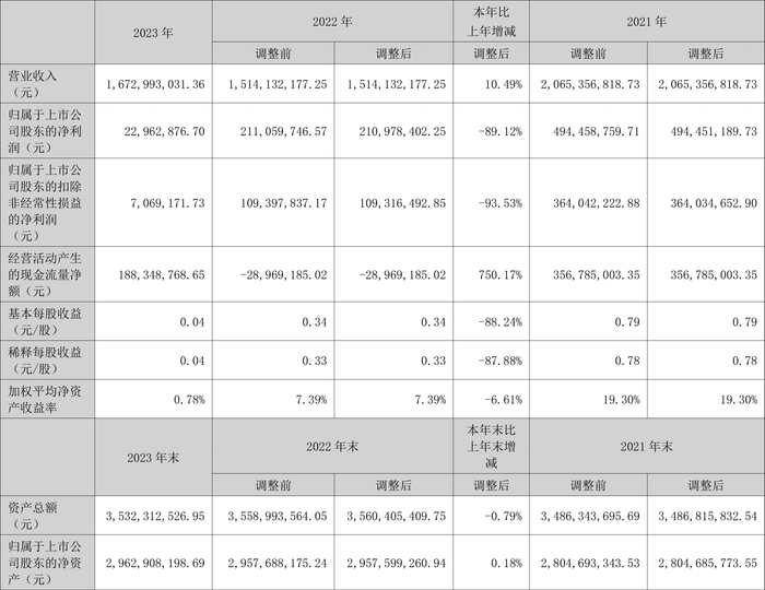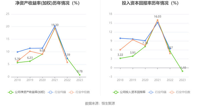 数据显示,2023年公司加权平均净资产收益率为0.78%,较上年同期下降6.61个百分点;公司2023年投入资本回报率为-1.10%,较上年同期下降6.67个百分点。