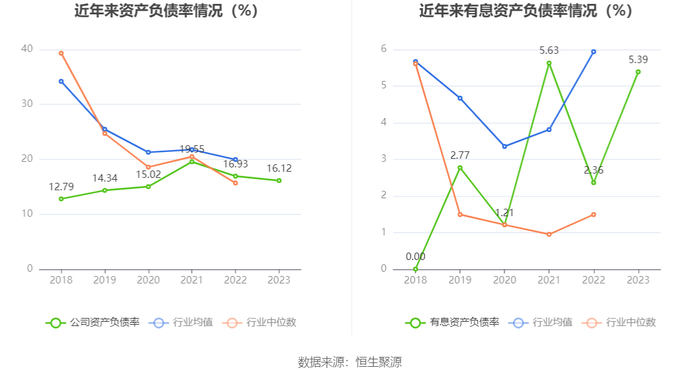 在偿债能力方面,公司2023年年末资产负债率为16.12%,相比上年末下降0.81个百分点;有息资产负债率为5.39%,相比上年末上升3.03个百分点。