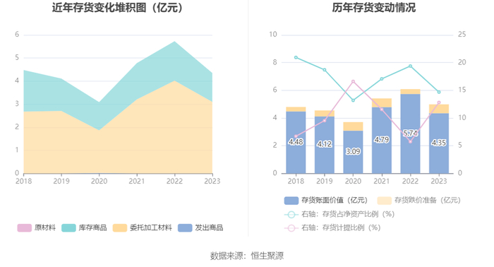 从存货变动来看,截至2023年末,公司存货账面价值为4.35亿元,占净资产的14.69%,较上年末减少1.38亿元。其中,存货跌价准备为6404.77万元,计提比例为12.82%。