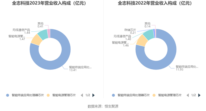 分产品来看,2023年公司主营业务中,智能终端应用处理器芯片收入13.41亿元,同比增长12.43%,占营业收入的80.14%;智能电源管理芯片收入1.47亿元,同比增长0.66%,占营业收入的8.81%;无线通信产品收入1.44亿元,同比增长2.89%,占营业收入的8.61%。