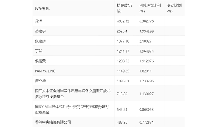 年报显示,2023年年末公司十大流通股东中,持股最多的为龚晖,占比6.38%。十大流通股东名单相比2023年三季报维持不变。在具体持股比例上,龚晖、蔡建宇、张建辉、丁然、侯丽荣、唐立华持股有所上升,PAN YA LING、国联安中证全指半导体产品与设备交易型开放式指数证券投资基金、国泰CES半导体芯片行业交易型开放式指数证券投资基金、香港中央结算有限公司持股有所下降。