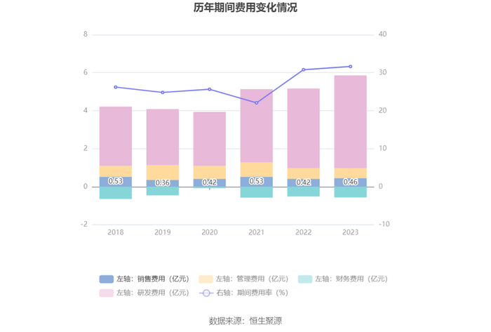 2023年,公司期间费用为5.30亿元,较上年同期增加6297.40万元;期间费用率为31.65%,较上年同期上升0.84个百分点。其中,销售费用同比增长8.29%,管理费用同比下降7.69%,研发费用同比增长16.48%,财务费用由去年同期的-5064.28万元变为-5587.29万元。