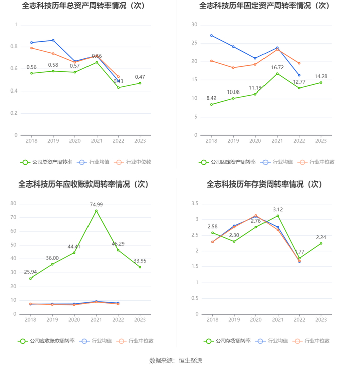 营运能力方面,2023年,公司公司总资产周转率为0.47次,上年同期为0.43次(2022年行业平均值为0.49次,公司位居同行业31/45);固定资产周转率为14.28次,上年同期为12.77次(2022年行业平均值为16.27次,公司位居同行业29/45);公司应收账款周转率、存货周转率分别为33.95次、2.24次。