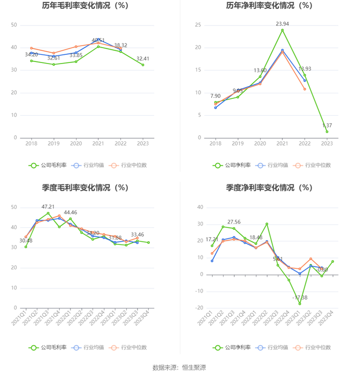 2023年,公司毛利率为32.41%,同比下降5.91个百分点;净利率为1.37%,较上年同期下降12.56个百分点。从单季度指标来看,2023年第四季度公司毛利率为32.63%,同比下降3.22个百分点,环比下降0.83个百分点;净利率为7.88%,较上年同期上升11.08个百分点,较上一季度上升8.68个百分点。