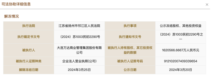 3月30日,券商中国记者查询国家企业信用信息公示系统发现,大连万达商业管理集团股份有限公司所持大连新达盟商业管理有限公司约162亿元股权已于3月25日解冻,执行法院为江苏省扬州市邗江区人民法院。
