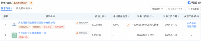 据天眼查APP显示,在上述投资协议落地前,大连新达盟商业管理有限公司的股东分别为大连万达商业管理集团股份有限公司、大连万裕企业管理有限公司,持股比例分别为99.9938%、0.0062%。