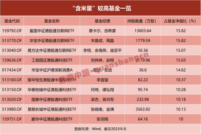 目前,公募基金对小米集团的持仓主要集中在港股方面,Wind数据显示,截至2023年年末,共计111只基金持仓小米集团,基金合计持仓占小米集团流通股的3.93%。其中,富国中证港股通互联网ETF、华宝中证港股通互联网ETF、易方达中证港股通互联网ETF、工银瑞信国证港股通科技30ETF是目前全市场“含米量”较高的基金,小米集团的权重均超15%。