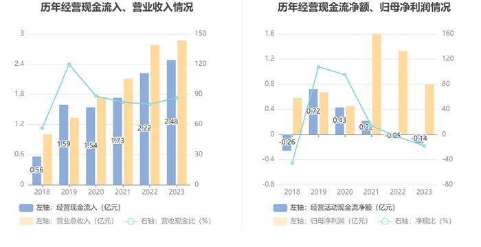 2023年,公司营业收入现金比为86.47%,净现比为-18.17%。