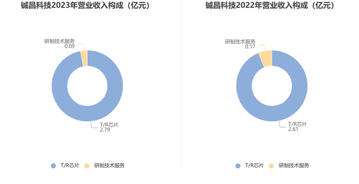 分产品来看,2023年公司主营业务中,T/R芯片收入2.79亿元,同比增长6.87%,占营业收入的96.93%;研制技术服务收入0.09亿元,同比下降48.58%,占营业收入的3.07%。