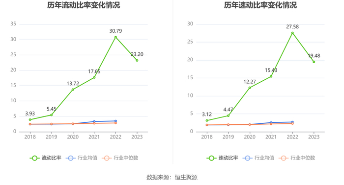 2023年,公司流动比率为23.20,速动比率为19.48。