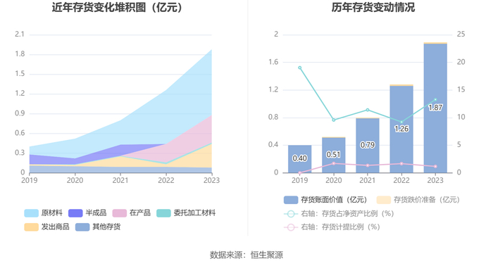 从存货变动来看,截至2023年末,公司存货账面价值为1.87亿元,占净资产的13.27%,较上年末增加6116.82万元。其中,存货跌价准备为221.13万元,计提比例为1.17%。