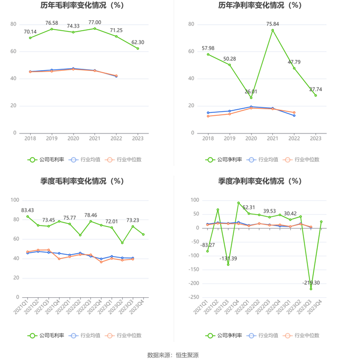2023年,公司毛利率为62.30%,同比下降8.95个百分点;净利率为27.74%,较上年同期下降20.05个百分点。从单季度指标来看,2023年第四季度公司毛利率为64.94%,同比下降9.52个百分点,环比下降8.29个百分点;净利率为23.45%,较上年同期下降24.36个百分点,较上一季度上升242.75个百分点。