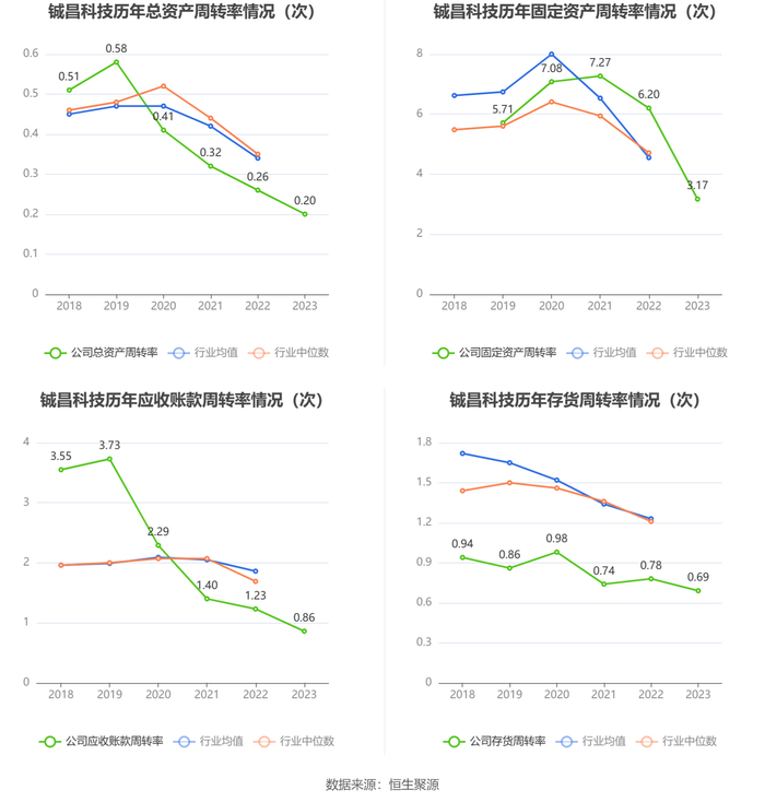 营运能力方面,2023年,公司公司总资产周转率为0.20次,上年同期为0.26次(2022年行业平均值为0.34次,公司位居同行业41/60);固定资产周转率为3.17次,上年同期为6.20次(2022年行业平均值为4.55次,公司位居同行业20/60);公司应收账款周转率、存货周转率分别为0.86次、0.69次。