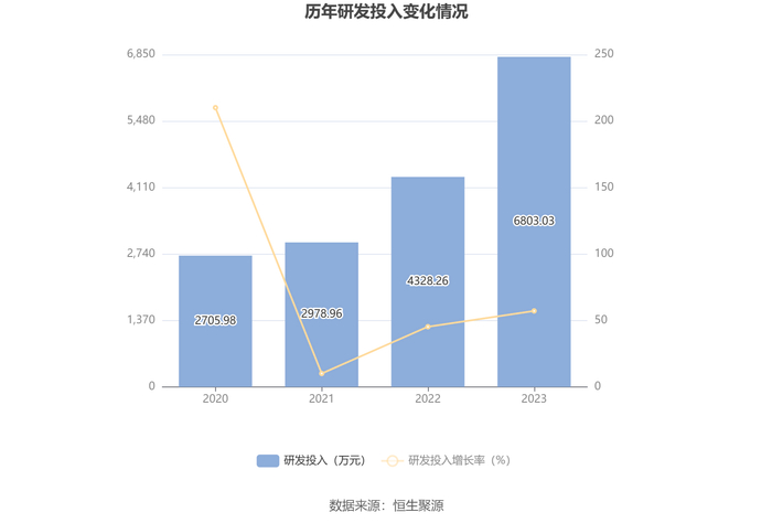2023年全年,公司研发投入金额为6803.03万元,同比增长57.18%;研发投入占营业收入比例为23.67%,相比上年同期上升8.09个百分点。此外,公司全年研发投入资本化率为0。