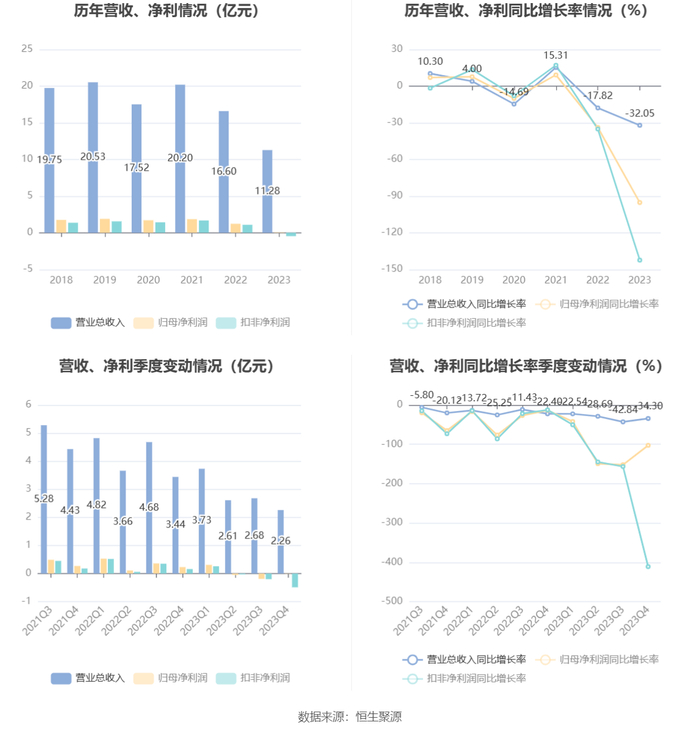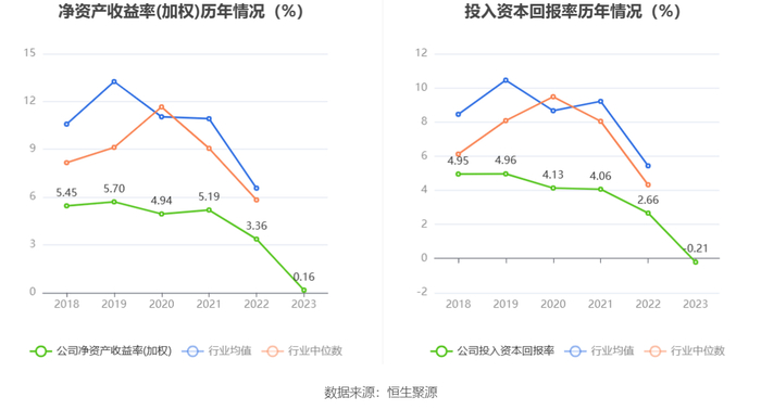 数据显示,2023年公司加权平均净资产收益率为0.16%,较上年同期下降3.20个百分点;公司2023年投入资本回报率为-0.21%,较上年同期下降2.87个百分点。