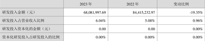 2023年全年,公司研发投入金额为6808.20万元,同比下降19.35%;研发投入占营业收入比例为6.04%,相比上年同期上升0.96个百分点。此外,公司全年研发投入资本化率为0。
