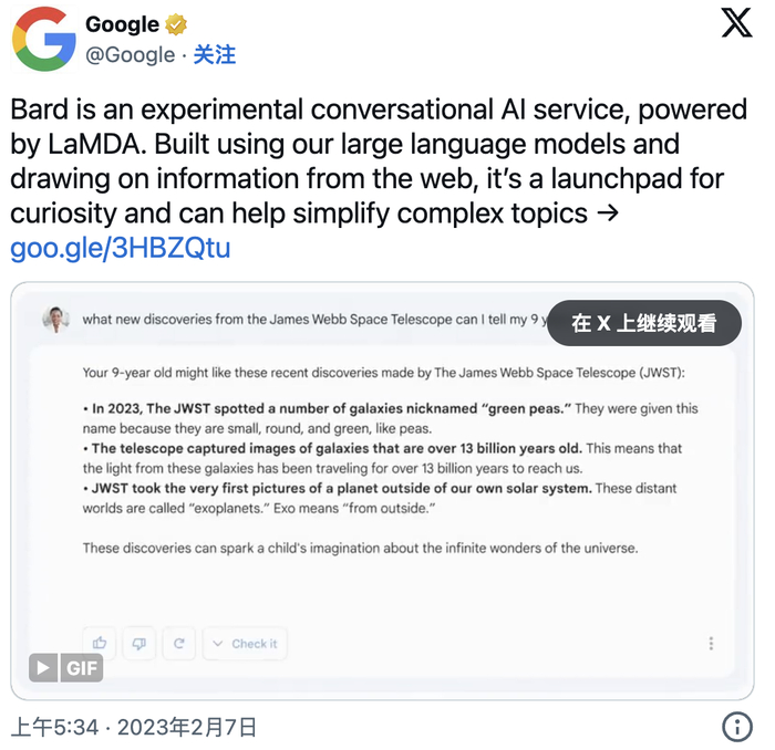 2023 年 2 月,谷歌推出的Bard在一个广告中说,它可以为 9 岁的孩子讲述詹姆斯·韦布太空望远镜的科学新发现,然而在视频广告里,它却说错了(弄错了第一张系外行星的照片)。这波反向营销(?)直接让谷歌的母公司Alphabet市值下跌了 1000 亿美元。
