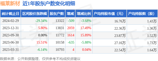 从股价来看,2023年12月31日至2024年2月29日,福莱新材区间跌幅为29.34%,在此期间股东户数减少509.0户,减幅为3.68%。