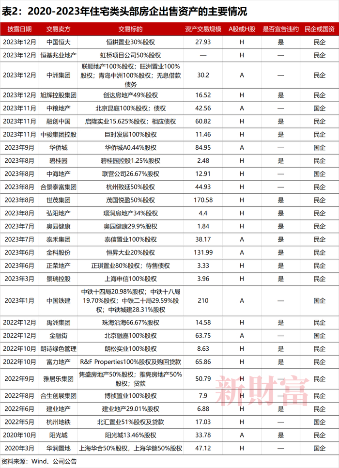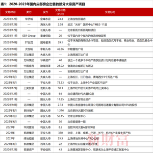 尽管成交难度不小,对资金的渴求,推动越来越多的住宅类房企步入出售资产的阵营。从时间来看,A股和港股的头部房企,过去3年出售的资产项目超过112项,其中2020年仅有2项,2022年则达到8项,2023年达到20项(表2)。相关存量资产的盘活正在破局。