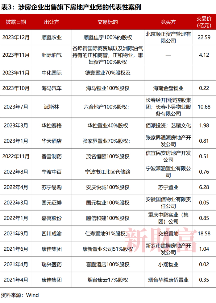 例如,中铝国际(2068.HK/601068)出售匀都置业100%股权;洲际油气(600759)处置谷埠街国际商贸城以及洲际油气持有的正和商管、正和物业、惠姆资产100%股权;海马汽车(000572)出售海马物业100%股权等。
