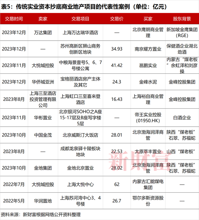 优质地产项目的长期保值增值性,也吸引了转型中的传统实业资本入局,其中不乏“水泥大王”“煤老板”“酒业老板”等(表5)。