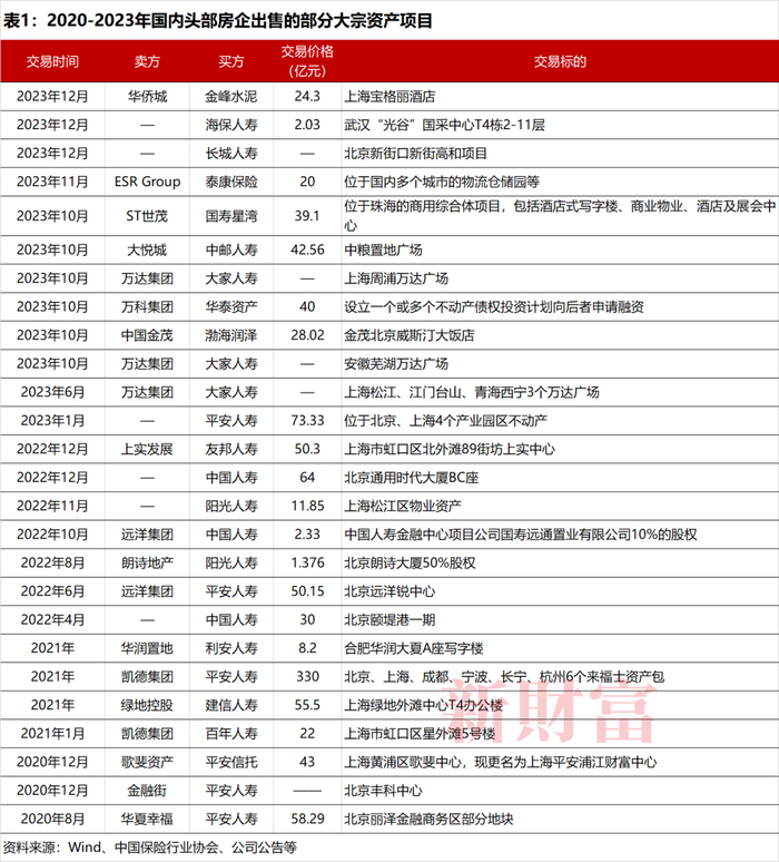 有意思的是,尽管不乏机构出售资产,当前,险资仍是房地产市场的接盘主力。自2022年下半年以来,相关交易更加频繁,金额不断创新高。如表1所示,27项商业地产交易中,23项的接盘方是险资。