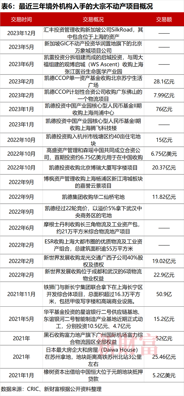 据不完全统计,近3年,境外机构在中国入手的大宗资产交易项目超过20项,交易金额超过400亿元(表6)。黑石集团、华平基金、凯德集团、摩根士丹利、铁狮门、博枫资产、易商红木(ESR)、太古地产(00962.HK)、新世界发展(00017.HK)等外资、港资机构正加速进场。