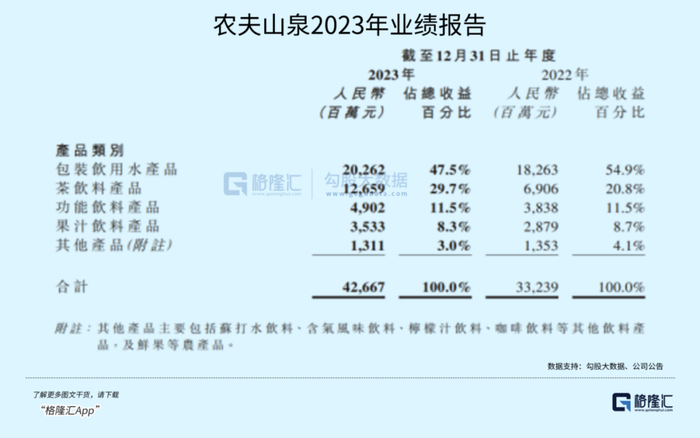 2023年,农夫山泉总收入426.67亿元,同比增加28.4%,2023年归母净利润120.79亿元,同比增加42.2%,双双创下新高。