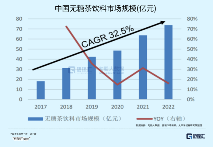 2017年至2022年,中国无糖茶饮料市场规模从18.1亿元快速增长73.8亿元,CAGR达33%。仅2022年,无糖茶市场增速达到7.9%,远高于含糖茶饮。