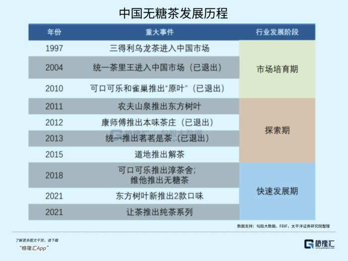 直到2011年,农夫山泉推出东方树叶,尽管争议较大,但是也将无糖茶这个概念带到了大众视野。康师傅、道地等品牌也开始推出自己的无糖茶产品。