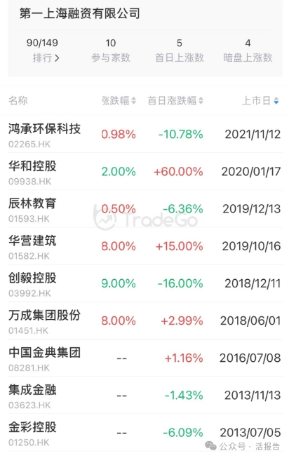 第一上海近期保荐的首日破发率为50%,最近保荐的一个项目为2021年上市的鸿承环保科技。