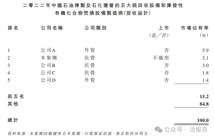 按2023年的收益计,公司是中国石油炼制及石化运营的第三大催化裂化设备制造商,市场份额约为6.3%;按2022年的收益计,公司亦是中国石油炼制及石化运营的第二大硫回收设备及挥发性有机化合物设备制造商,市场份额约为3.1%。