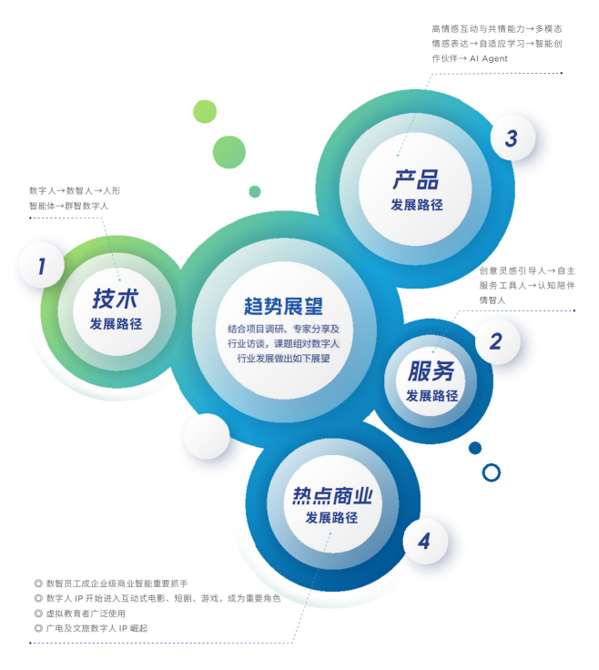 在趋势预判上,本期《报告》从技术、产品、服务、商业化四个维度提出了数字人行业可能的发展路径。