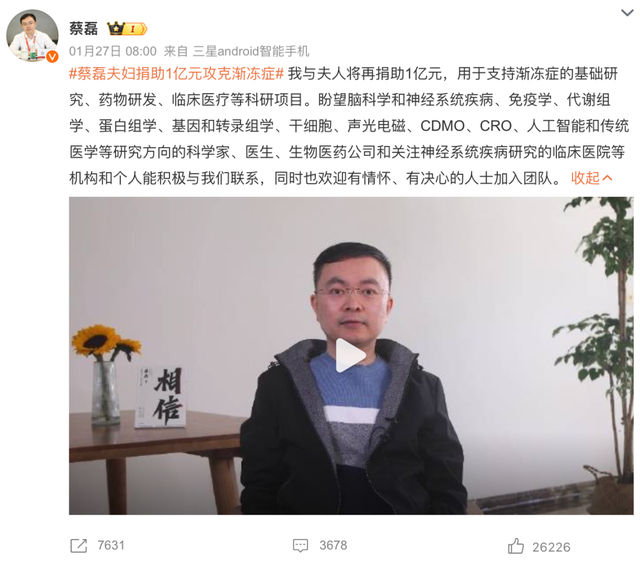 1月27日,京东原副总裁、渐冻症抗争者蔡磊在微博发布消息称:我与夫人将再捐助1亿元,用于支持渐冻症的基础研究、药物研发、临床医疗等科研项目。