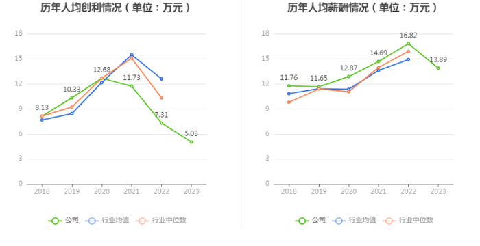 截至2023年末,公司员工总数为1394人,人均创收152.86万元,人均创利5.03万元,人均薪酬13.89万元,较上年同期分别下降17.04%、31.20%、17.42%。