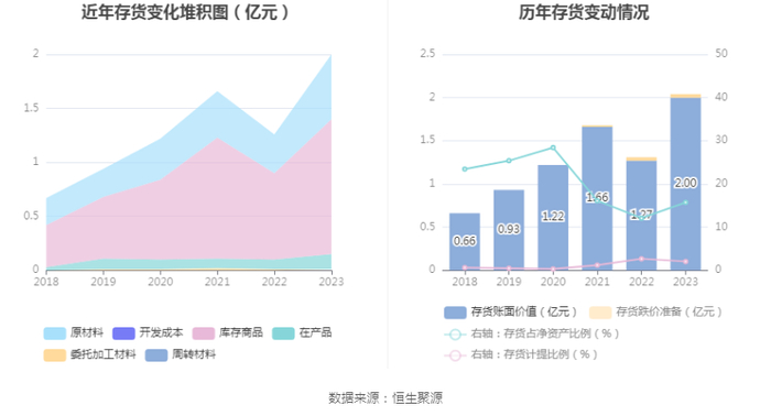 从存货变动来看,截至2023年年末,公司存货账面价值为2.0亿元,占净资产的15.74%,较上年末增加7350.48万元。其中,存货跌价准备为422.28万元,计提比例为2.07%。