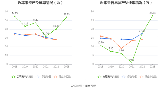 在偿债能力方面,公司2023年年末资产负债率为53.83%,相比上年末上升13.48个百分点;有息资产负债率为27.64%,相比上年末上升10.30个百分点。