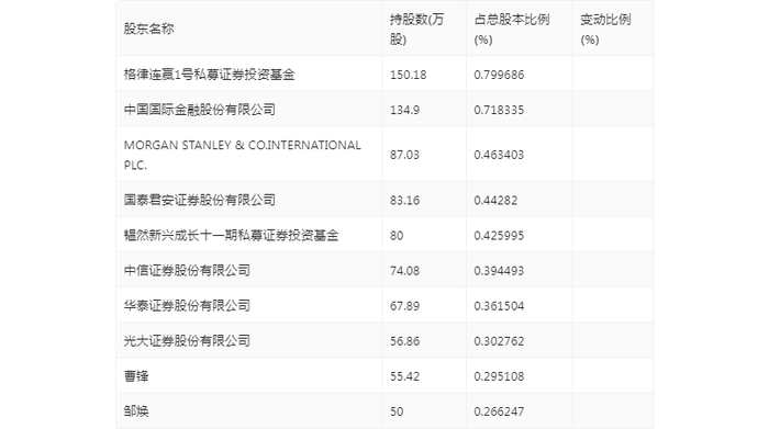 年报显示,2023年年末公司十大流通股东中,新进股东为格律连赢1号私募证券投资基金、中国国际金融股份有限公司、MORGAN STANLEY & CO.INTERNATIONAL PLC.、国泰君安证券股份有限公司、韫然新兴成长十一期私募证券投资基金、中信证券股份有限公司、曹锋、邹焕,取代了三季度末的徐林峰、郭桂莲、广发百发大数据策略成长灵活配置混合型证券投资基金、中国国际金融香港资产管理有限公司-FT、航长紫荆私募证券投资基金、王雷英、刘晓龙、上海中油船舶燃料供应有限公司。在具体持股比例上,华泰证券股份有限公司、光大证券股份有限公司持股有所上升。