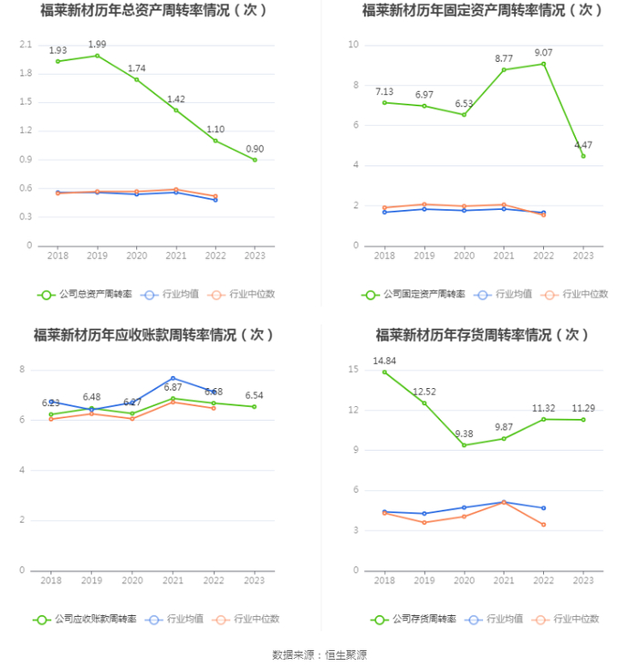 营运能力方面,2023年,公司公司总资产周转率为0.90次,上年同期为1.10次(2022年行业平均值为0.48次,公司位居同行业2/19);固定资产周转率为4.47次,上年同期为9.07次(2022年行业平均值为1.66次,公司位居同行业1/19);公司应收账款周转率、存货周转率分别为6.54次、11.29次。