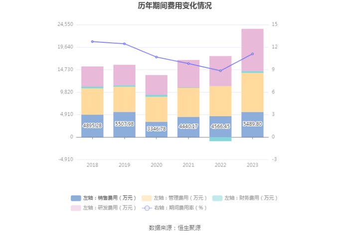 2023年,公司期间费用为2.36亿元,较上年同期增加6807.95万元;期间费用率为11.10%,较上年同期上升2.25个百分点。其中,销售费用同比增长20.22%,管理费用同比增长29.9%,研发费用同比增长40.7%,财务费用由去年同期的-870.65万元变为375.37万元。