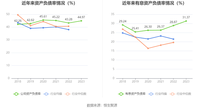 在偿债能力方面,公司2023年年末资产负债率为44.97%,相比上年末上升1.69个百分点;有息资产负债率为31.37%,相比上年末上升2.50个百分点。