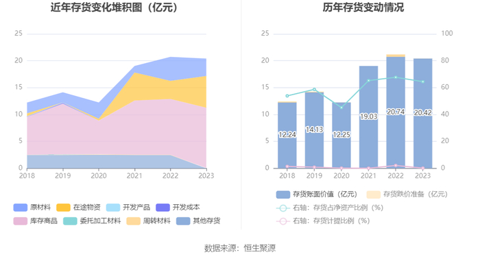 从存货变动来看,截至2023年年末,公司存货账面价值为20.42亿元,占净资产的64.46%,较上年末减少3208.45万元。其中,存货跌价准备为182.58万元,计提比例为0.09%。