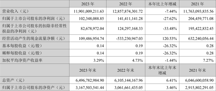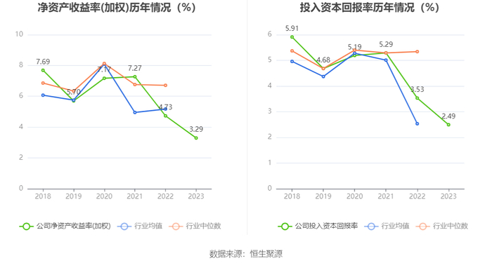 数据显示,2023年公司加权平均净资产收益率为3.29%,较上年同期下降1.44个百分点;公司2023年投入资本回报率为2.49%,较上年同期下降1.04个百分点。