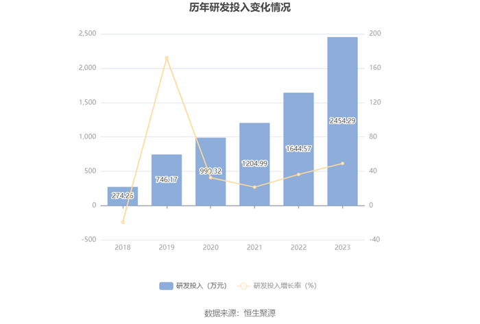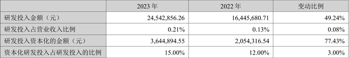 2023年全年,公司研发投入金额为2454.29万元,同比增长49.24%;研发投入占营业收入比例为0.21%,相比上年同期上升0.08个百分点。此外,公司全年研发投入资本化率为15.00%。