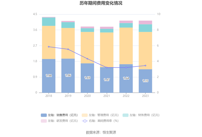2023年,公司期间费用为4.13亿元,较上年同期减少46.90万元;但期间费用率为3.47%,较上年同期上升0.25个百分点。其中,销售费用同比下降17.83%,管理费用同比增长2.08%,研发费用同比增长45.21%,财务费用同比增长69.78%。