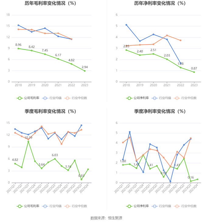 2023年,公司毛利率为2.94%,同比下降1.88个百分点;净利率为0.87%,较上年同期下降0.41个百分点。从单季度指标来看,2023年第四季度公司毛利率为3.40%,同比下降0.84个百分点,环比上升2.57个百分点;净利率为0.35%,较上年同期下降1.28个百分点,较上一季度上升0.19个百分点。