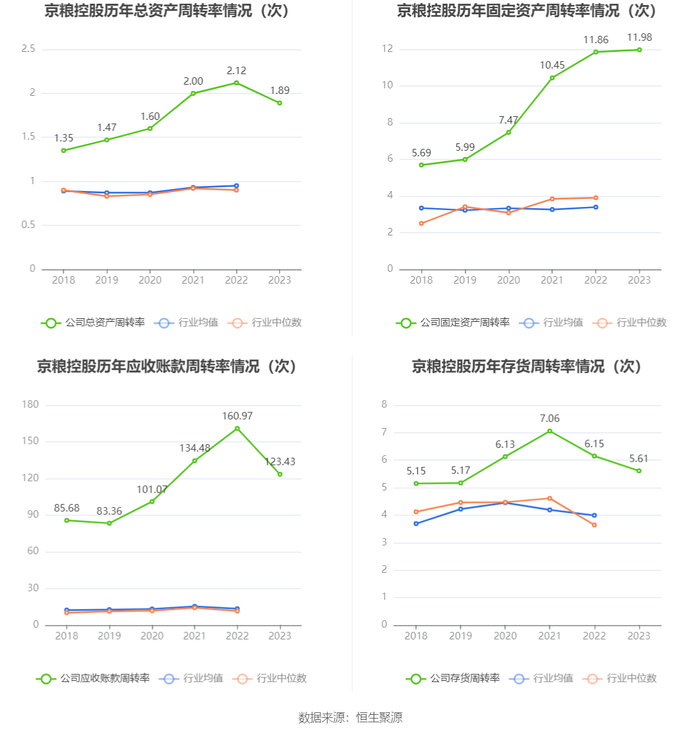 营运能力方面,2023年,公司公司总资产周转率为1.89次,上年同期为2.12次(2022年行业平均值为0.95次,公司位居同行业2/25);固定资产周转率为11.98次,上年同期为11.86次(2022年行业平均值为3.39次,公司位居同行业2/25);公司应收账款周转率、存货周转率分别为123.43次、5.61次。
