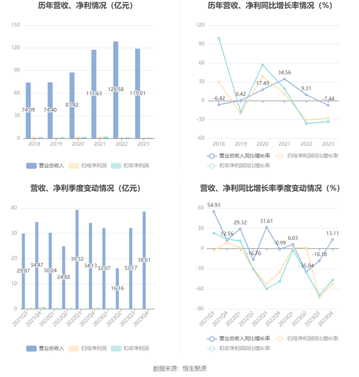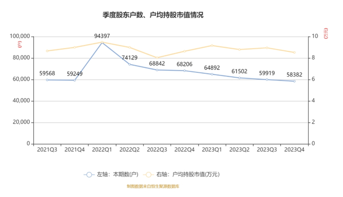 筹码集中度方面,截至2023年末,公司股东总户数为5.84万户,较三季度末下降了1537户,降幅2.57%;户均持股市值由三季度末的8.95万元下降至8.52万元,降幅为4.88%。