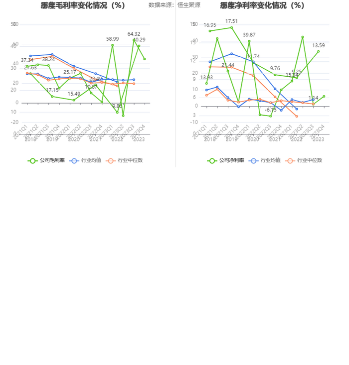2023年,公司毛利率为40.29%,同比上升30.43个百分点;净利率为13.59%,较上年同期上升4.34个百分点。从单季度指标来看,2023年第四季度公司毛利率为44.86%,同比上升44.03个百分点,环比下降19.46个百分点;净利率为6.02%,较上年同期下降4.00个百分点,较上一季度上升4.88个百分点。