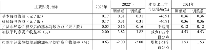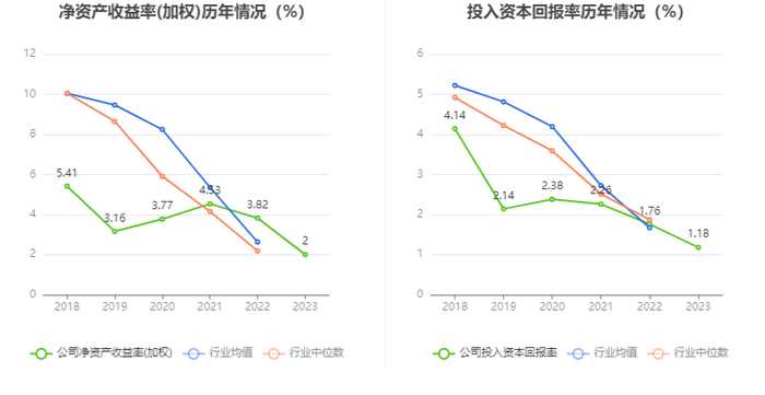 数据显示,2023年公司加权平均净资产收益率为2.00%,较上年同期下降1.82个百分点;公司2023年投入资本回报率为1.18%,较上年同期下降0.58个百分点。